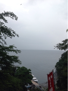 階段を下る前に琵琶湖を眺める。