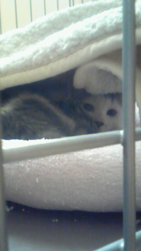 掃除機が始まると、ゲージのなかでは毛布の中に潜り込みじっと様子を伺っています
