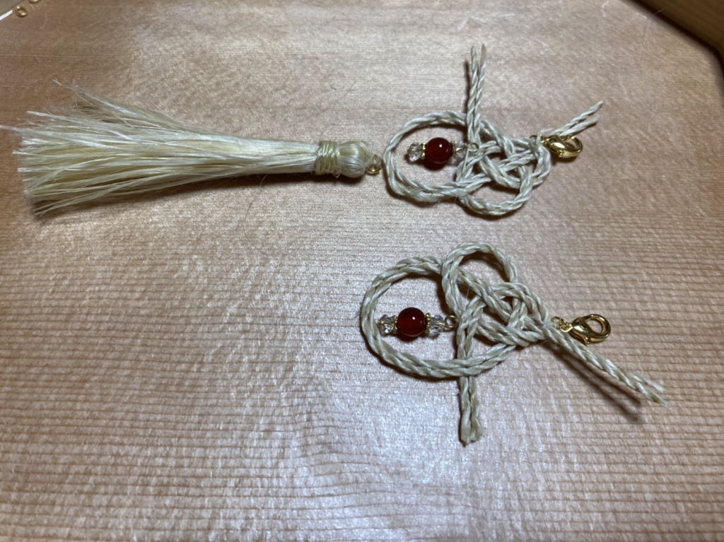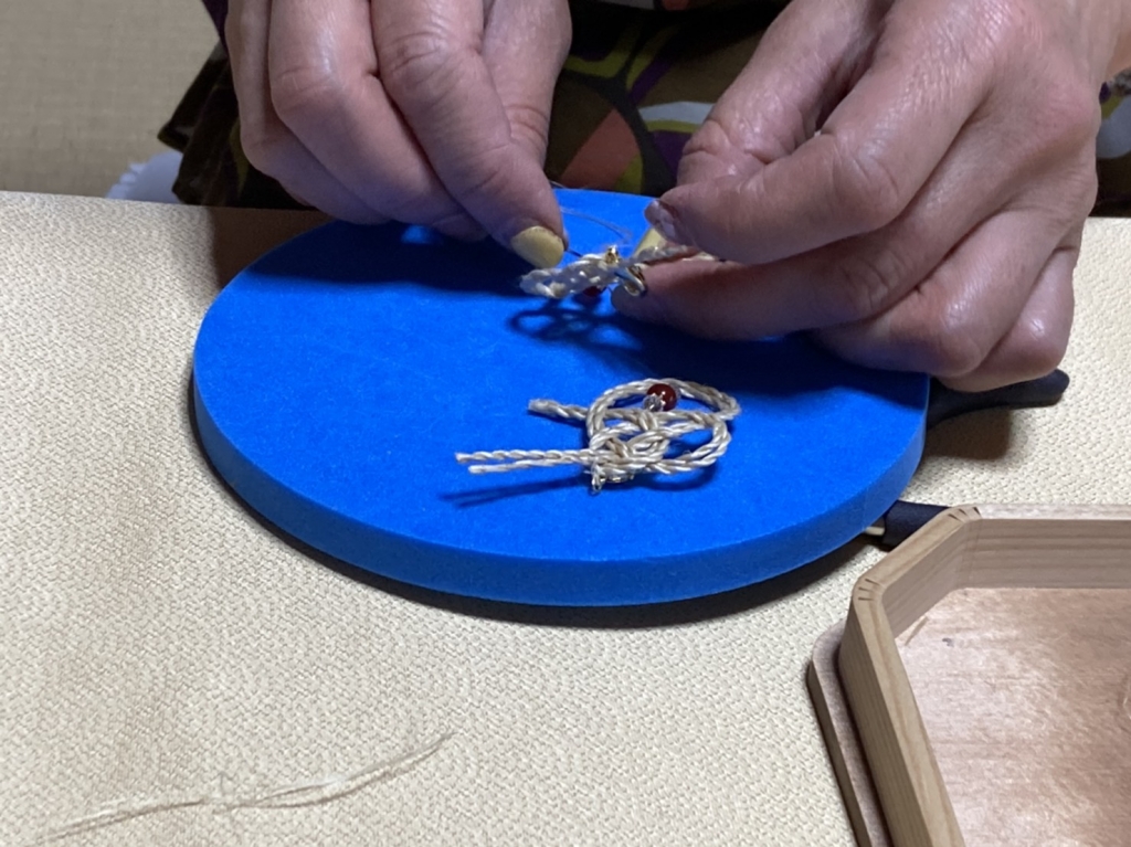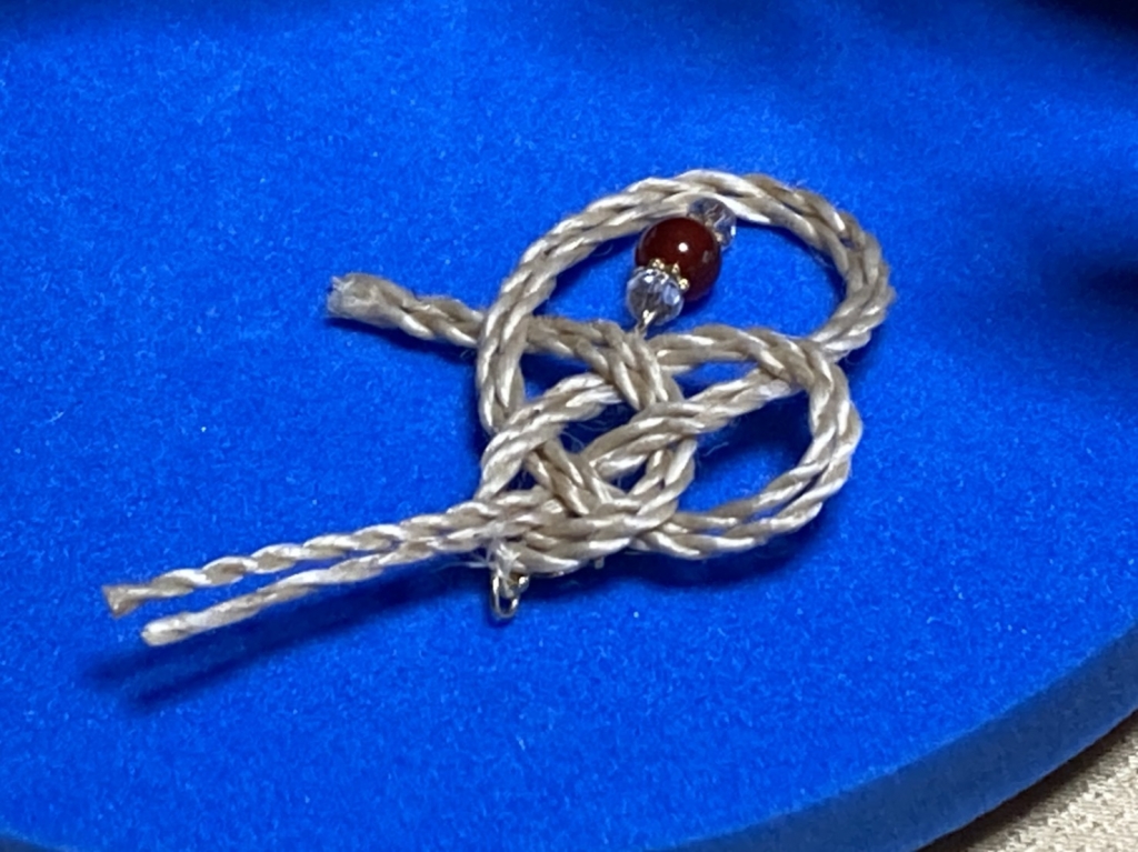そこに繋げて準備しておいたカーネリアンを、精麻で結びに縫い付けます。