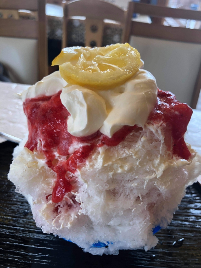 新作の試食だったのですが、イチゴと練乳と生クリームと氷砂糖で漬け込んだレモンのかき氷でした。