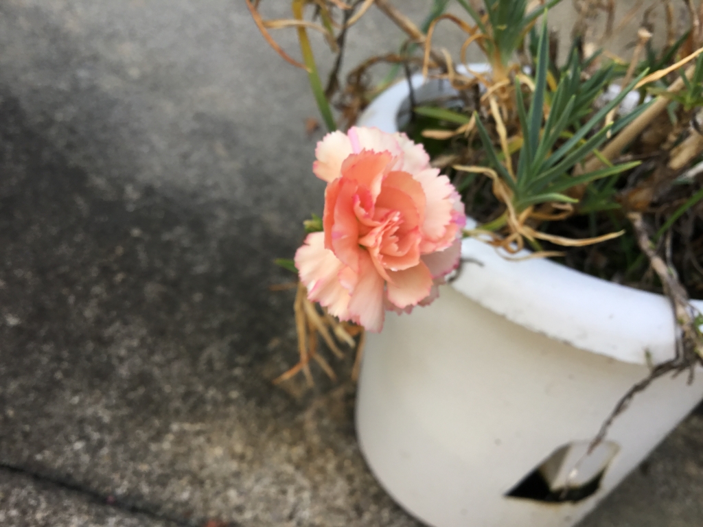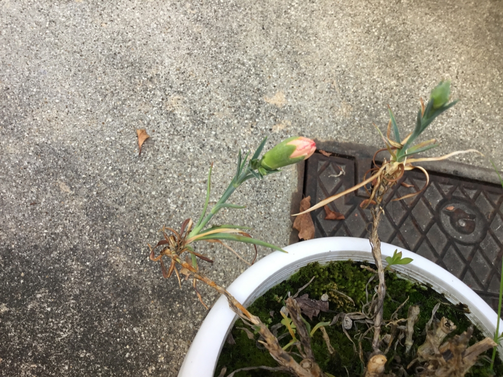 1年前の鉢植えのピンクのカーネーションが咲きました。