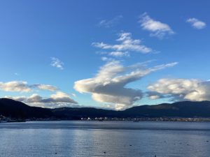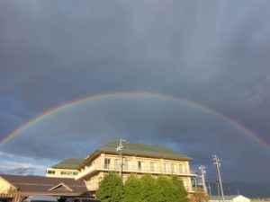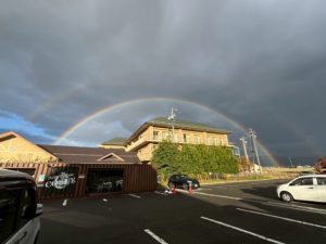 諏訪湖に寄ってから帰りましたが、その諏訪湖近くのガラスの里で大きな虹が出ました🌈