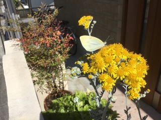 昨日の朝、玄関前のお花に蝶々が蜜を吸いにきていました♪